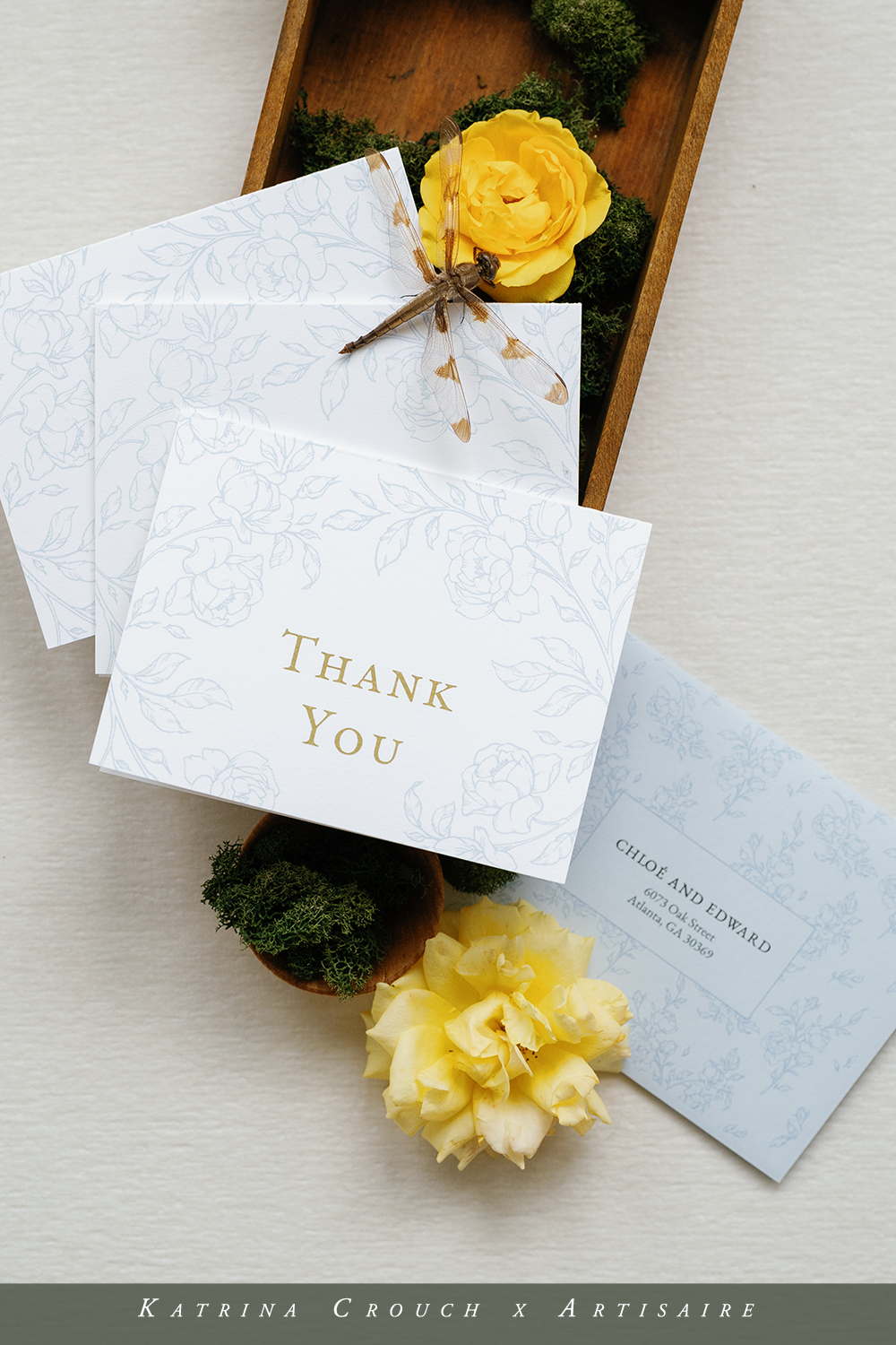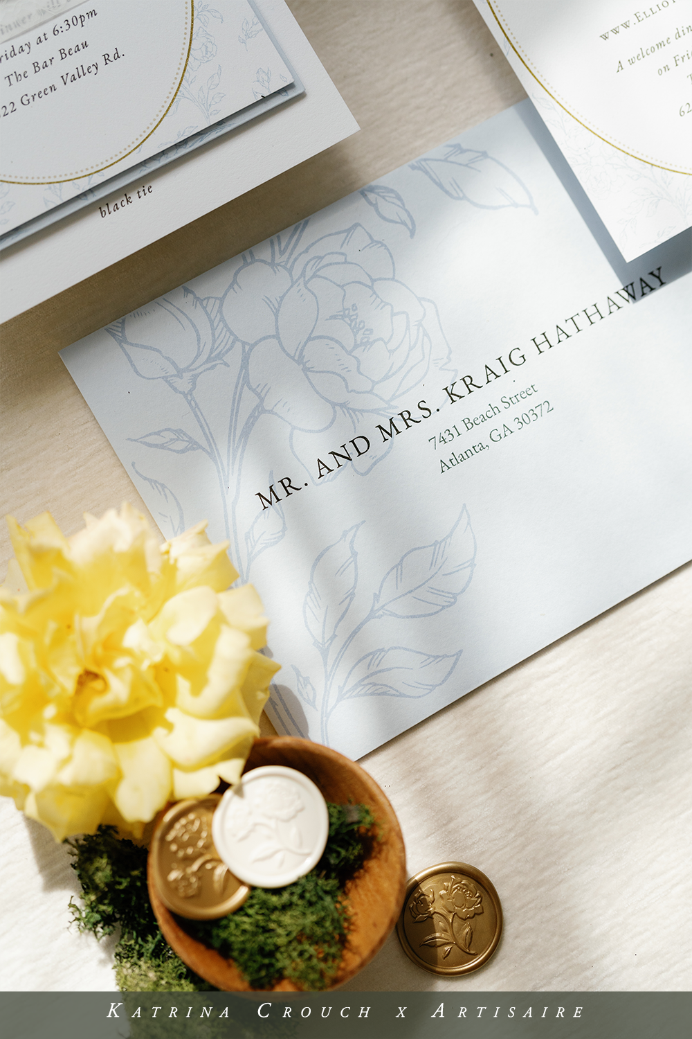 As you’ve probably guessed, this suite was designed to pair perfectly with the Garden Rose wax seal (did you know that there is a personalized option as well? She’s a beaut!) and coordinates well with the Botanical Initial and Secret Lock wax seal designs. Of course I love the gold wax, but also enjoyed using the buttercream and dusty blue wax colors as well with this blue color palette. I obviously went for a more monochrome aesthetic—but wax seals are such a great way to go bold! Someday I’ll definitely branch out and explore that more with this suite.