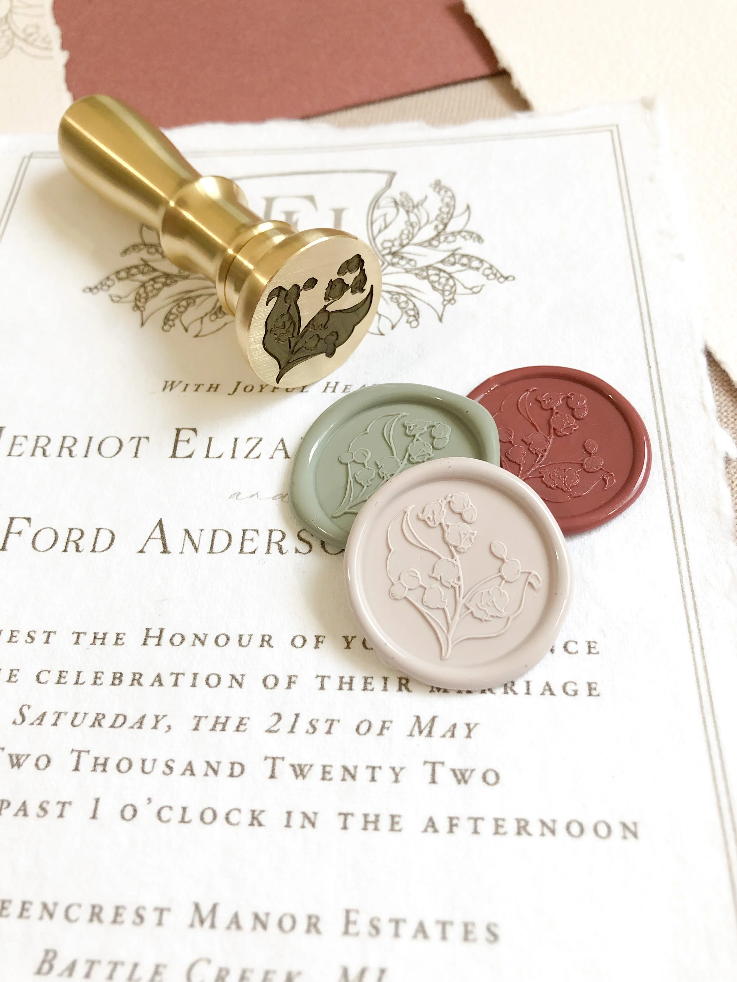 Thus, when I was called upon to design the perfect wedding floral stamp and wedding suite (excepting my forever love, Vintage Peony stamper), it was simply a no brainer to explore Lily of the Valley. Admittedly, it took me a whole year to work out this design. I wanted to submit it to another submission the previous year but it wasn’t quite ready… until now! And I’m so excited to have this beauty join my wax seal collection!