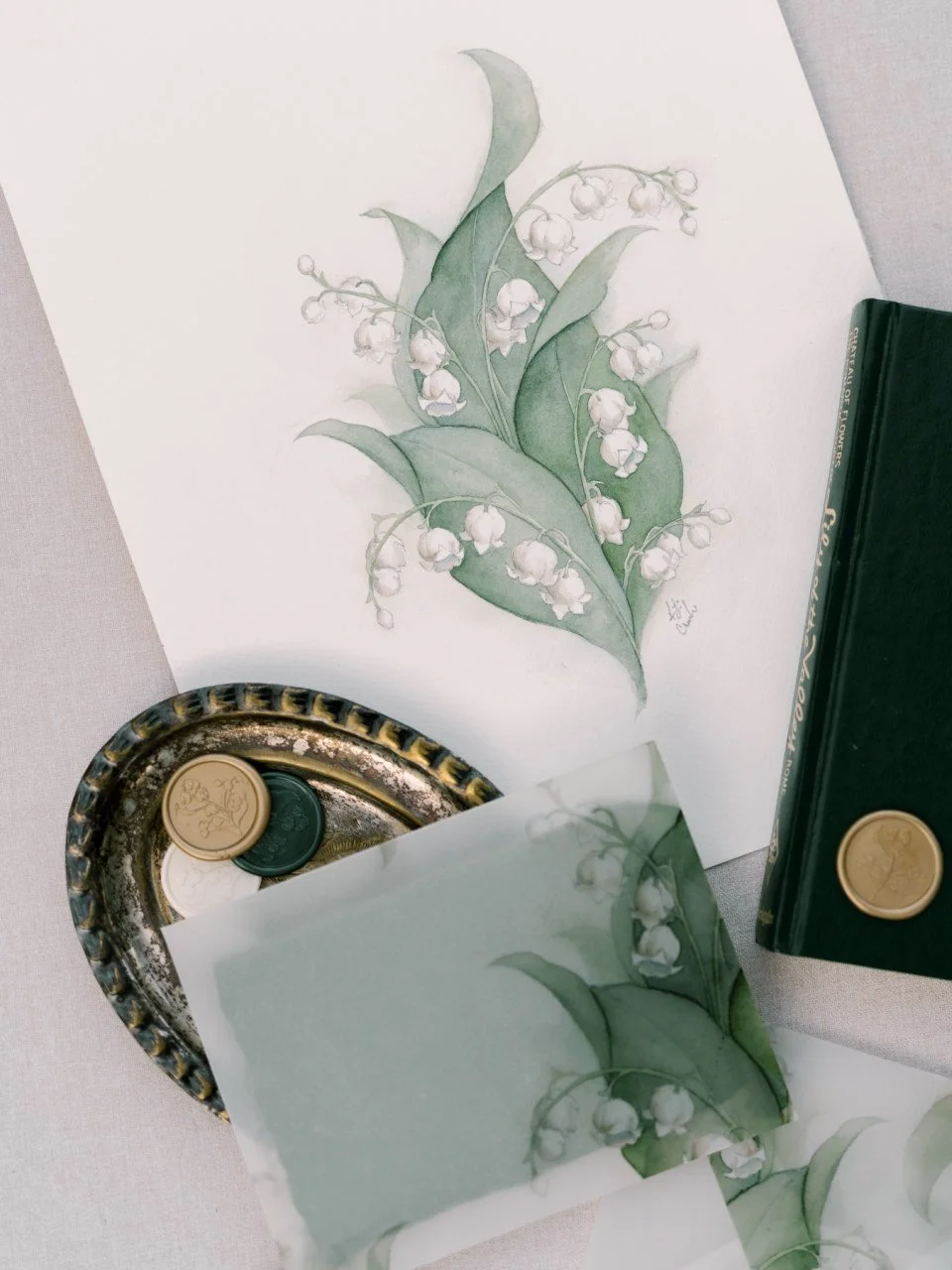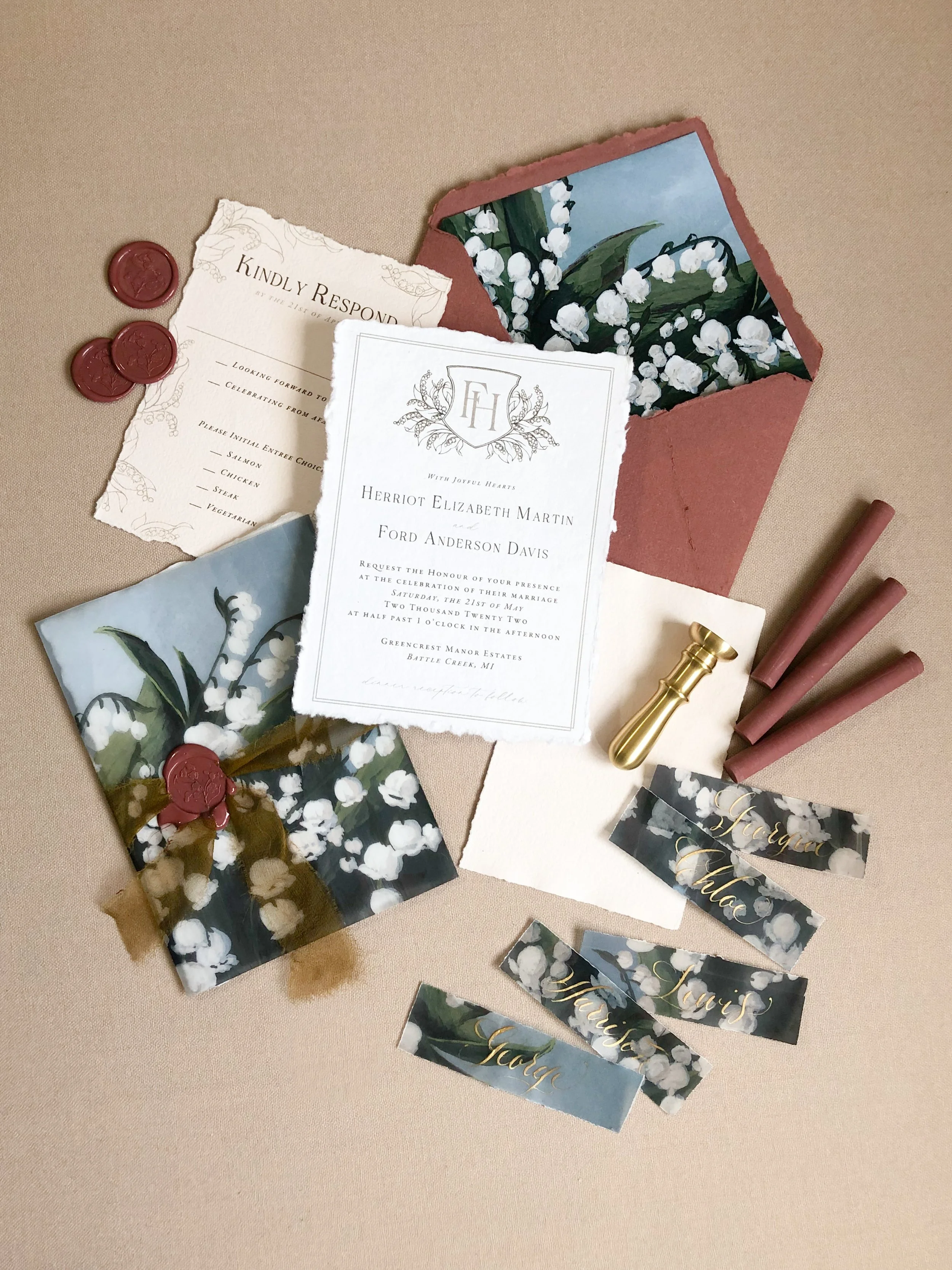 I wasn’t about to stop with one suite! I create another design that is a little softer in nature and closer to my true aesthetic. Printed on beautiful vellum envelopes, this lily of the valley watercolor allows the lily of the valley wax seal to really shine and pairs perfectly with the graceful bells and dancing leaves that sway to and fro on both. This design isn’t currently for sale, but I am hoping to explore different ways to make it available in the near future! Stay in touch ;)